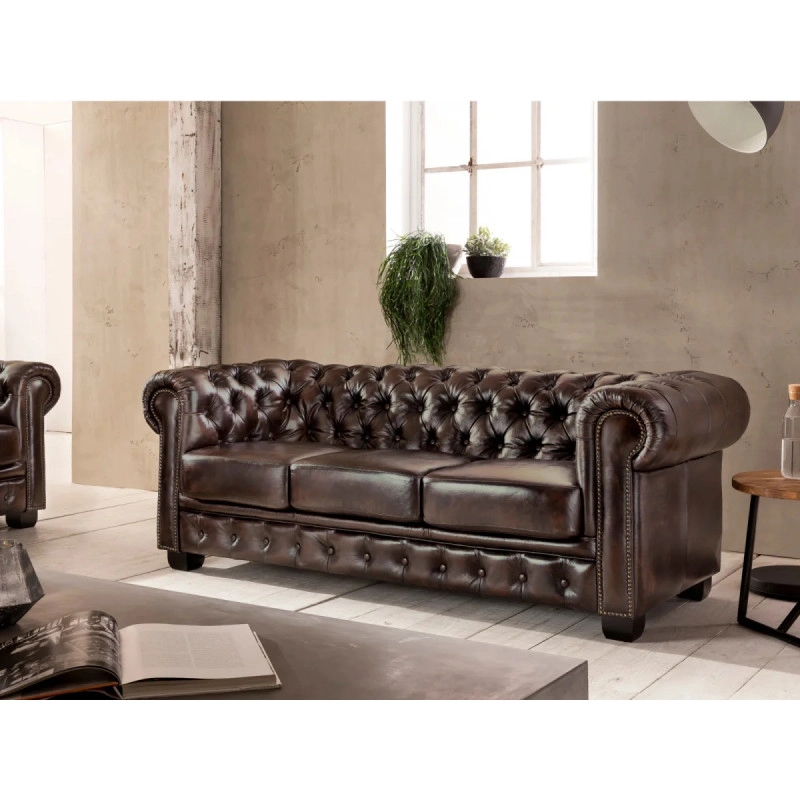 Kvalita zpracování je na prvním místě; pravá kůže zaručuje dlouhou životnost a snadnou údržbu, zatímco robustní konstrukce z masivního dřeva poskytuje potřebnou stabilitu a podporu. Tato pohovka není jen kus nábytku, ale investicí do pohodlí a stylu, který zkrášlí váš domov po mnoho let. Užijte si pohodlné posezení a nezapomenutelné chvíle s blízkými na této úžasné pohovce. Nechte se inspirovat a přetvořte svůj prostor na místo, kde se budete cítit jako doma. Prozkoumejte naše další křesla Chesterfield a objevte, jak snadno můžete oživit svůj interiér!