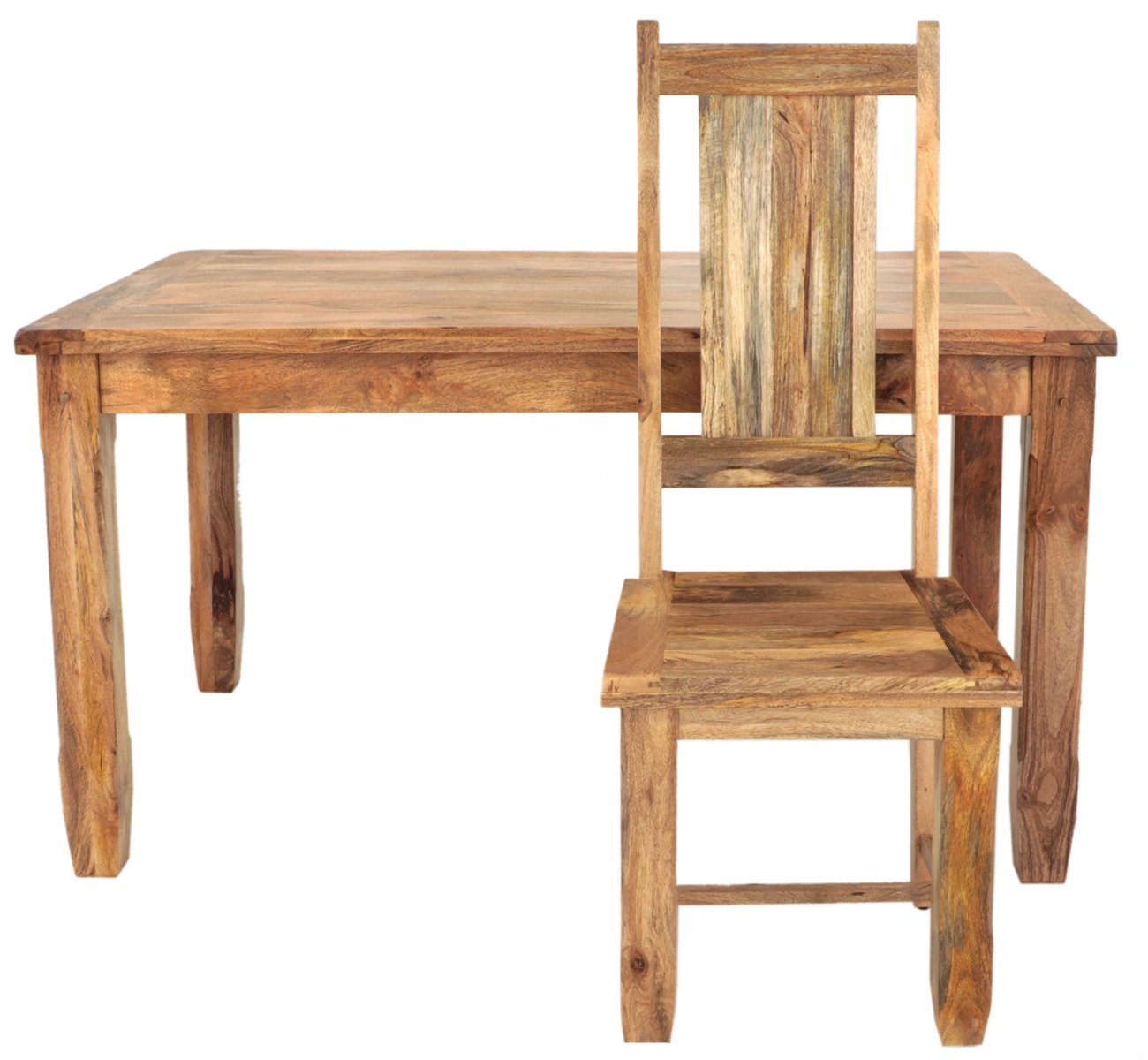 Jídelní set DEVI o rozměrech stolu 140 cm na šířku, 90 cm na hloubku a 76 cm na výšku, je dostatečně prostorný na to, aby pohodlně usadil až šest osob. Jeho součástí jsou také čtyři židle a jedna lavice, což z něj činí ideální volbu pro rodinné večeře i slavnostní příležitosti. Vyroben z mangového dřeva původem z Indie, tento set ztělesňuje kvalitu a autentičnost. Povrch nábytku je jemně opracovaný, čímž zajišťuje jeho odolnost vůči každodennímu používání a zanechává krásný přírodní vzhled.