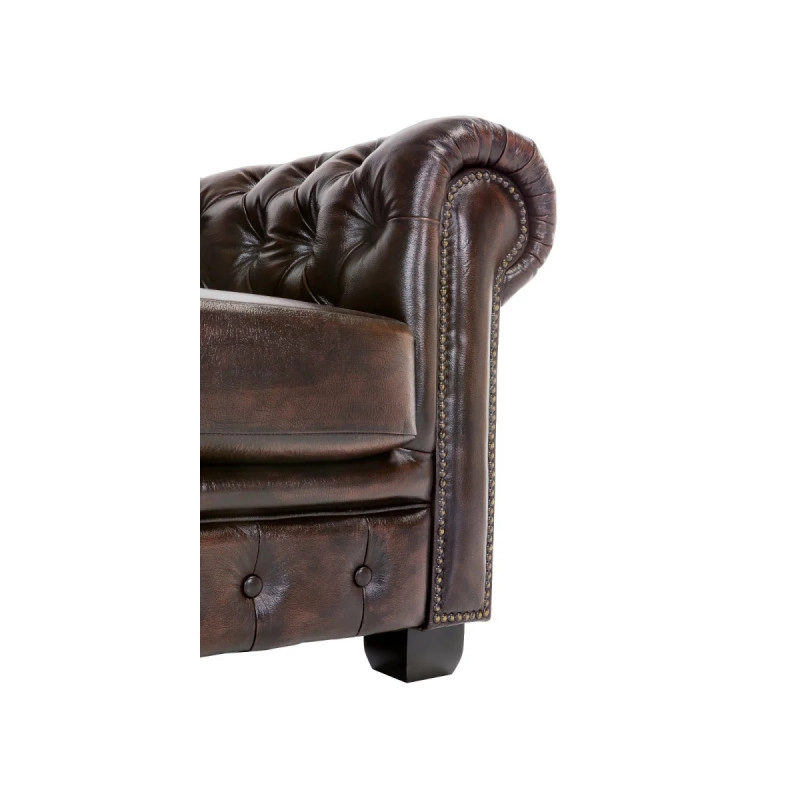 Pohovka Chesterfield, vyrobená z prvotřídní hnědé pravé kůže, kombinuje klasický styl s výjimečným komfortem. Její rozměry 268×100×72 cm poskytují dostatek prostoru pro pohodlné sezení čtyř osob, což ji činí ideální volbou pro každý obývací pokoj.