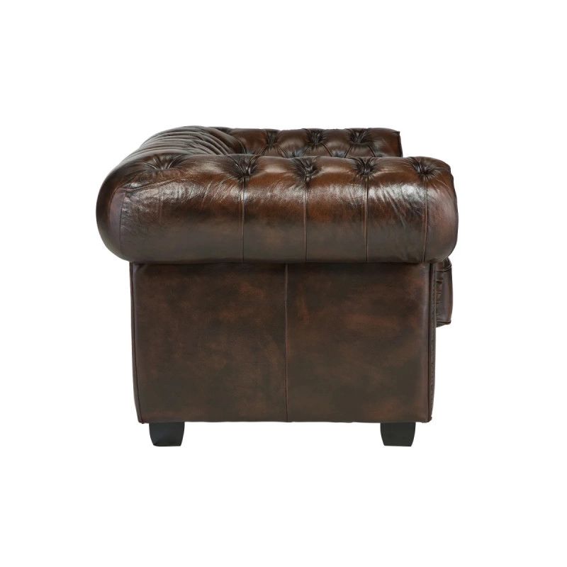Každý detail této pohovky byl pečlivě promyšlen a zpracován s důrazem na kvalitu a styl. Povrch pravé kůže nejenže přináší vizuální působivost, ale je také odolný a snadno se udržuje. Hnědá barva pohovky pak působí teple a přívětivě, což vás a vaše hosty vždy přivítá s otevřenou náručí. Tvar pohovky, charakteristický pro Chesterfield s jeho prohloubenými tlačítky a elegantně tvarovanými opěradly a područkami, přidává na její unikátnosti a půvabu.