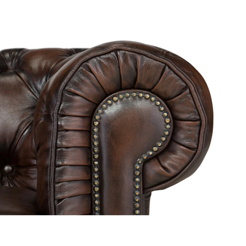 Sedací souprava Chesterfield Big z pravé kůže v elegantní hnědé barvě přináší do vašeho interiéru nejen pohodlí, ale i nezaměnitelný styl, který vás okouzlí na první pohled. Každý detail této soupravy byl pečlivě promyšlen, od ikonických knoflíků po klasické prošívání, které odráží tradiční britský design. Představte si, jak se po náročném dni usadíte do této luxusní sedačky, jejíž měkké, ale oporu poskytující polstrování vás obklopí pohodlím a teplem.