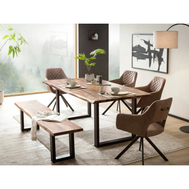 Objevte kouzlo přírodní elegance s jídelní sestavou Bullwer, která zahrnuje robustní stůl, lavici a čtyři židle Corton z kvalitní lakované akácie v teplém hnědém odstínu. Tato masivní sestava je ideální volbou pro stylové a pohodlné stolování ve vaší jídelně.