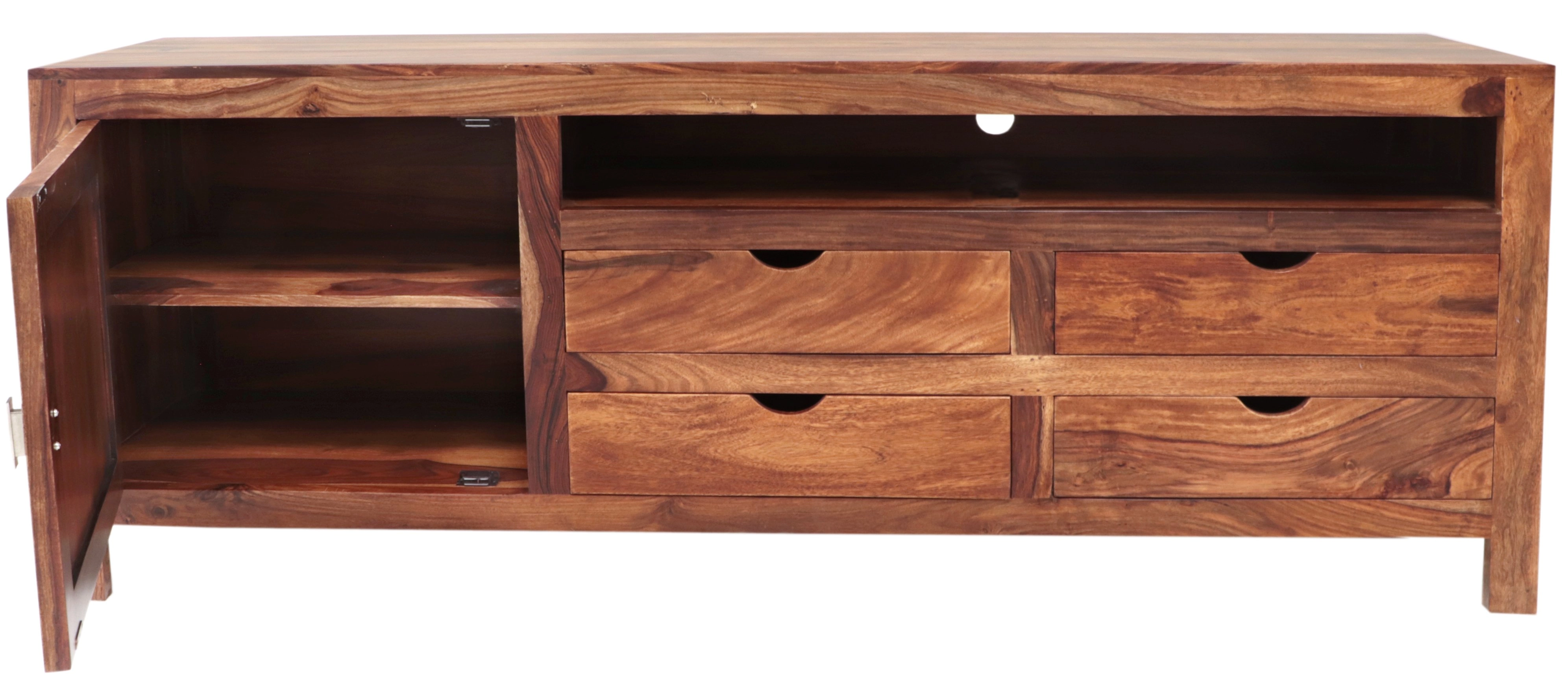 TV stolek z masivu nabízí nejen stylový vzhled, ale také praktické uspořádání. Je vybaven poličkou na elektroniku o šířce 109,5 cm a výšce 12,5 cm, která je ideální pro umístění herních konzolí, set-top boxů nebo DVD přehrávačů. Prostorné, čtyři šuplíky poskytují dostatek úložného místa, přičemž jejich vnitřní rozměry jsou 48,5 cm na šířku a 13,5 cm na výšku, zatímco vnější rozměry činí 52,5 cm na šířku a 15,5 cm na výšku. Kromě toho je stolek vybaven jednou skříňkou, kde můžete schovat další doplňky nebo příslušenství.