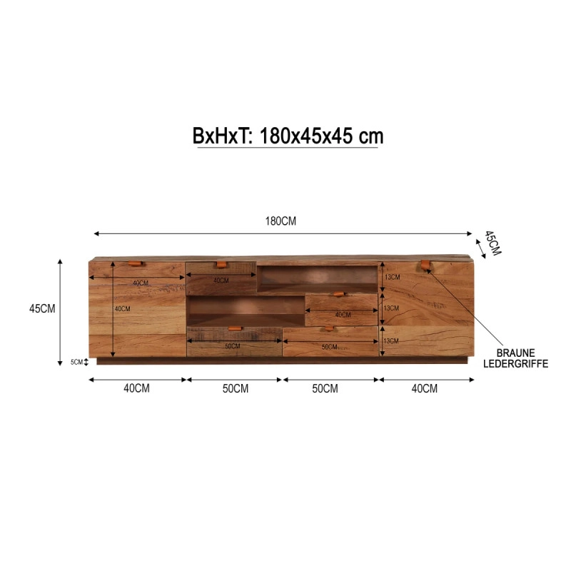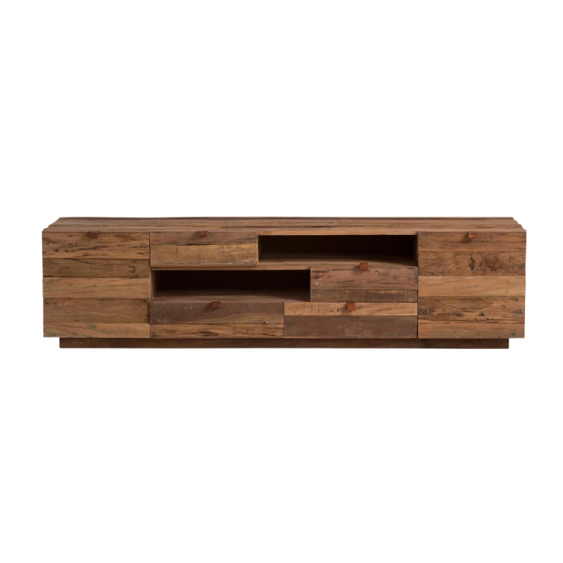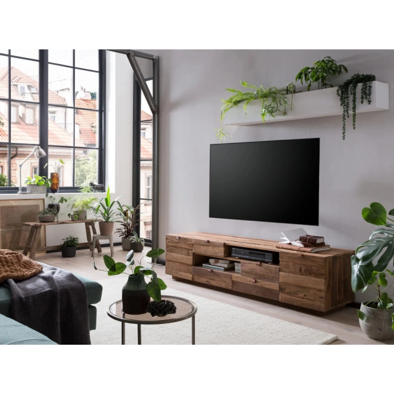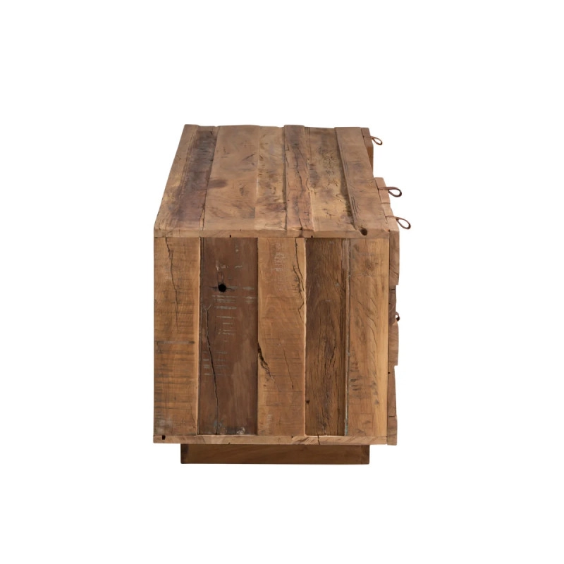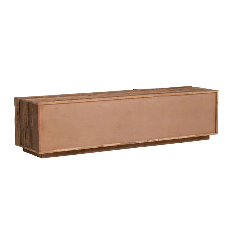 Každý kus tohoto nábytku je unikátní díky použití recyklovaného dřeva, které bylo pečlivě vybráno a zpracováno tak, aby zvýraznilo jeho přirozenou krásu a odolnost. Povrchová úprava je navržena tak, aby zdůraznila přirozenou texturu dřeva a zároveň ochránila materiál před každodenním opotřebením. Díky tomu je stolek nejen krásný, ale i praktický a snadno udržovatelný. Tento kousek nábytku je nejen praktickým místem pro vaši televizi, ale stane se i centrálním bodem pro setkávání rodiny a přátel.